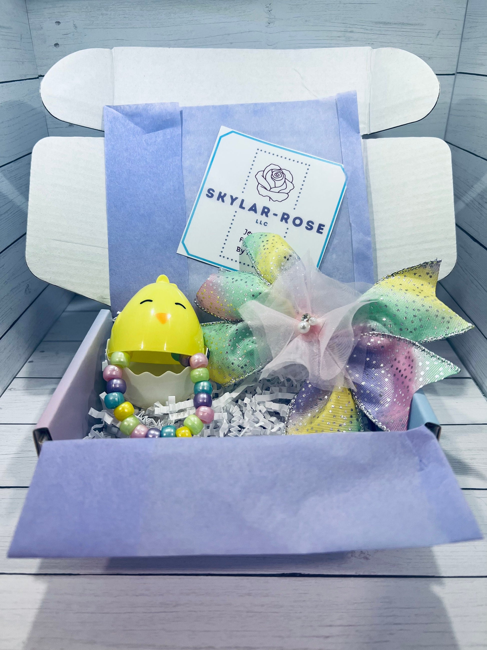 This listing is for an Easter bracelet box and is stuffed with some of my favorite things (Easter egg may vary by color.Bracelets are made for kids and range in sizes between 5 and 5-3/4 so please check the variations as there are 3 different types of bracelets to choose from. Matching hair bows will join the box for a festive holiday. Hair bows are adorned to a metal clip to slide nicely into the hair. They are about 5 inches and length and make a cute added accessory!
