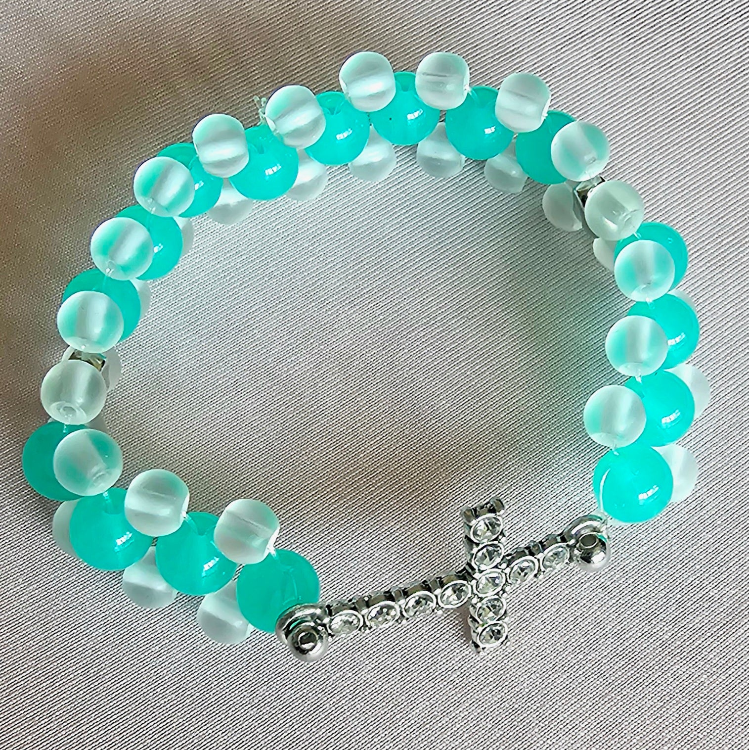 Add a splash of faith and fun with the Serenity Cross Double-Row Bracelet! This cheerful bracelet features two rows of bright turquoise and frosty white beads that look like little ocean bubbles, mixed with tiny silver heart charms that say "love" in a big way. Right in the middle, a sparkly cross charm with shiny crystals twinkles like a star, reminding you of hope and happiness. It’s super stretchy, so it’s easy to pop on and wear all day while you pray, play, or celebrate special moments. Perfect for anyone who loves a bit of spiritual sparkle, this bracelet is great for church, family gatherings, or just to brighten your day with a joyful vibe!